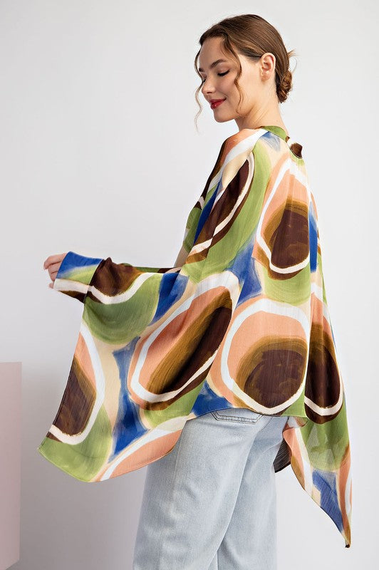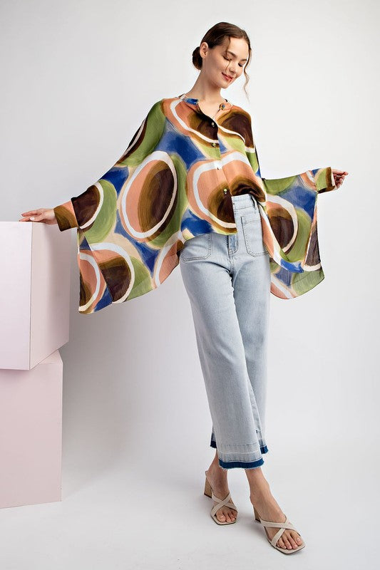Bold and lightweight, this relaxed-fit blouse stands out with its earthy and blue-toned abstract print. The flowy batwing sleeves add movement and style. Perfect to pair with jeans or tailored pants. (100% polyester)